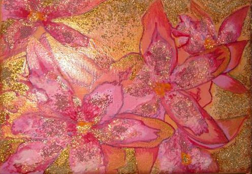 Radiant with deep and rich pinks and golds, these most beautiful of flowers are given depth and touch through simple papier mache and layered colours, and sprinkled with a multitude of pink and gold beads. A delightful addition to the wall of any room.