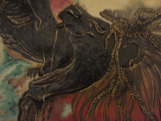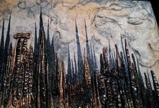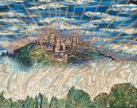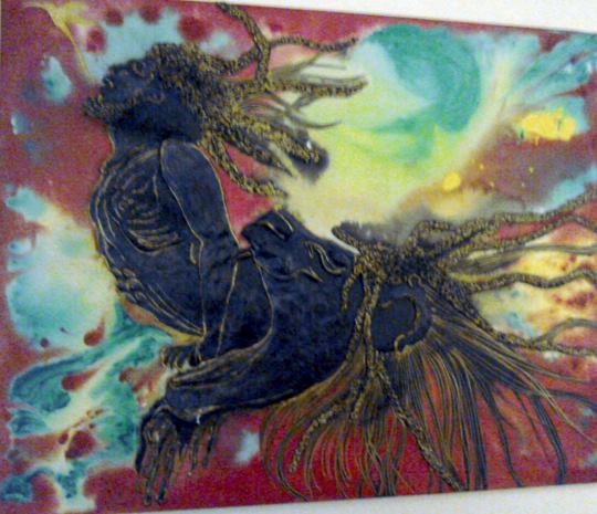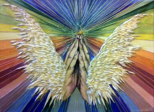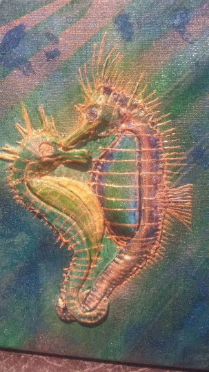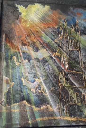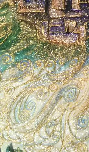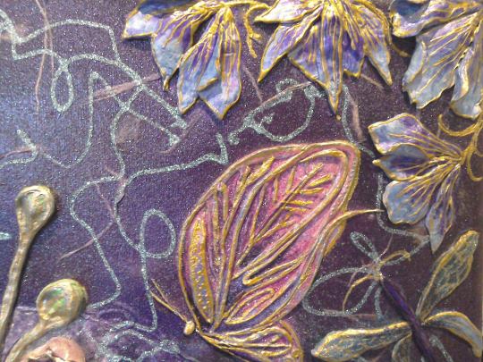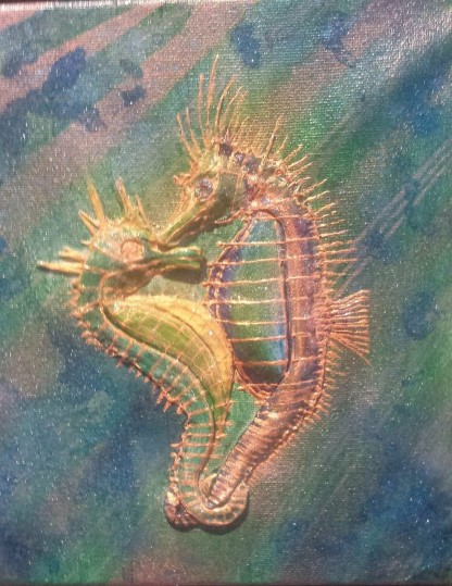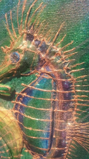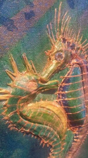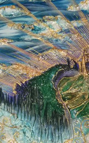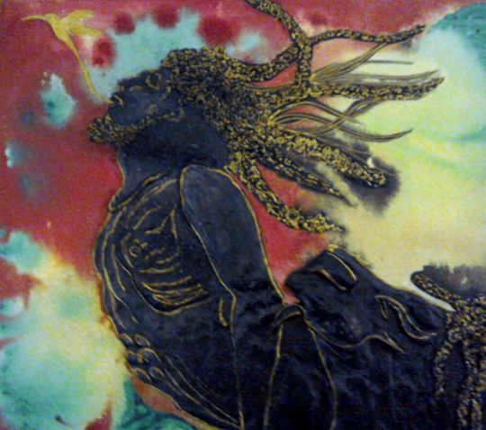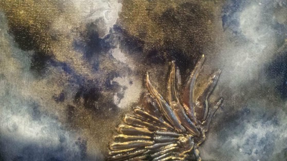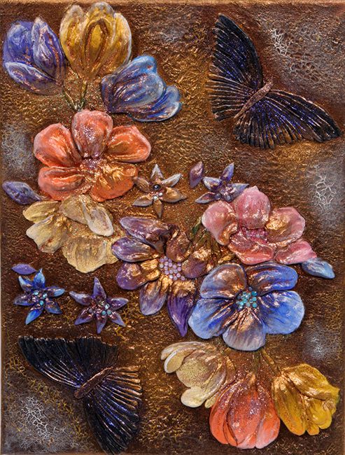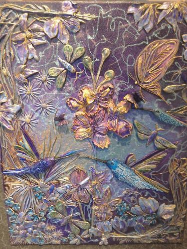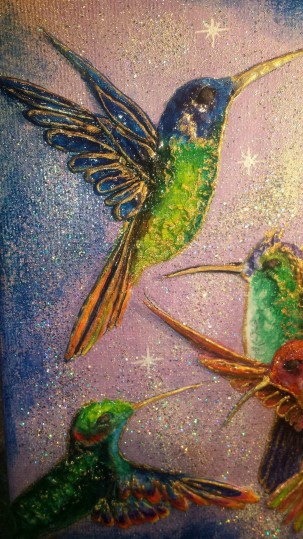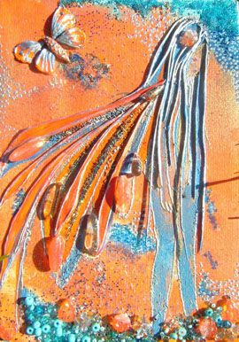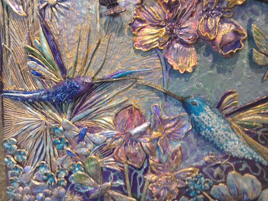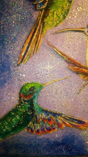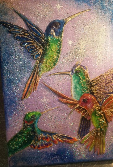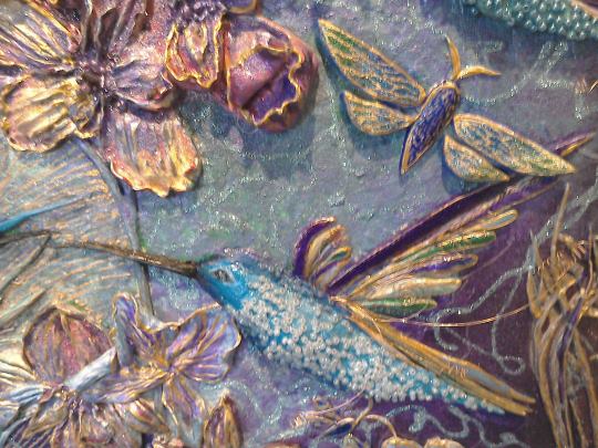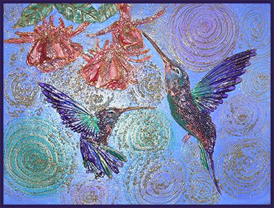 What can I say? I just love hummingbirds and the supernatural powers of love that they still symbolise in many parts of the world today. These tiny, delightful birds are a pleasure to behold. In this painting, clays and glass beads accentuate , hovering in the summer blue, their long, slender beaks extracting nectar from the many blooms they discover. Clays and glass beads bring depth to the tiny bodies, while the beauty and grace of their flight is captured in startling blue upon their outspread wings.