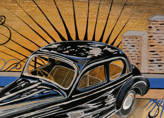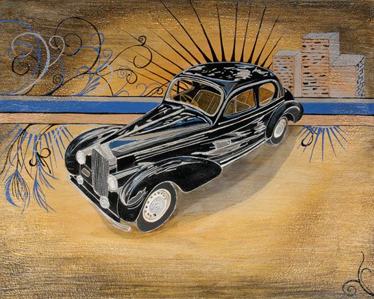 This painting depicts a classic and shining 1930's DELAGE/D6-3L Guillore motor car. In a detour from the usual detail of texture and depth I enjoy so much in my other works, this classic car required smooth lines and elegant curves to do justice to its beautiful design, gleaming bodywork and stylish leather interior. A simple crackle-glaze background lets the style of this lovely car speak for itself.