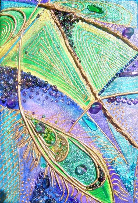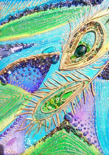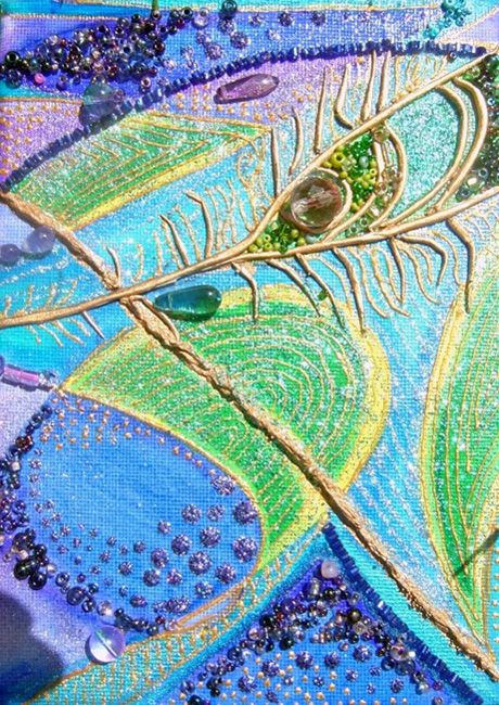 This little set of four canvases was inspired by the vivid colours of the peacock's plumage. Moving from canvas to canvas, the vibrant blues, purples and shimmering greens are enhanced using tiny stones and beads which catch the eye wonderfully as light is reflected. Peacock feathers have been used for healing for tens of thousands of years in most every culture. They are said to carry spiritual healing energy that can assist those seeking balance and harmony in their lives.